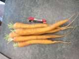 Enormous, tender, golden yellow and white crisp carrots! Our carrots are amazing this year, really big and still tender. The size is courtesy of our raised beds and uncompacted soil! Certified Organic by MOFGA.